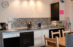 Eine große Gemeinschaftsküche mit Herd, Backofen, Mikrowelle, Kaffeemaschine, Kühlschrank,